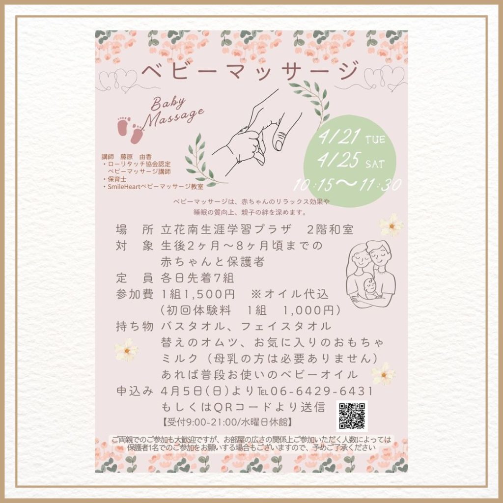 ベビーマッサージで優しく触れ合い、赤ちゃんからのメッセージを感じてみませんか?月齢の近い赤ちゃん同士、お母さん同士の交流もあり、リラックスしてお過ごしいただけます。ゆったりとした幸せな時間を一緒に過ごしましょう♪お申込みは4月5日(日)からです。詳細はチラシをご覧ください。皆様のご参加お待ちしております!